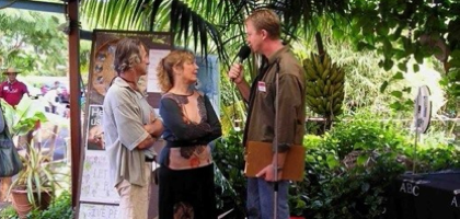 We visited eight families in an idyllic settlement. We had to wait as they weren’t ready for us. On arrival through the famous ‘spike gates’ we were treated with a full-blown welcoming ceremony. John Vail is a hero there. They thought I looked like him. First there was a Huli dance in full costume – quite sophisticated. Then the dances to welcome me. Then a Polynesian-style dance with flowers petals everywhere in a home-made, cute community house – all decorated. The table with the seed savers had an elegant display of fruit and vegie collections. All amazing. Short speeches.