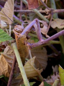 Large brown praying mantis, Archimantis latistyla, eats hedge grasshopper – 7