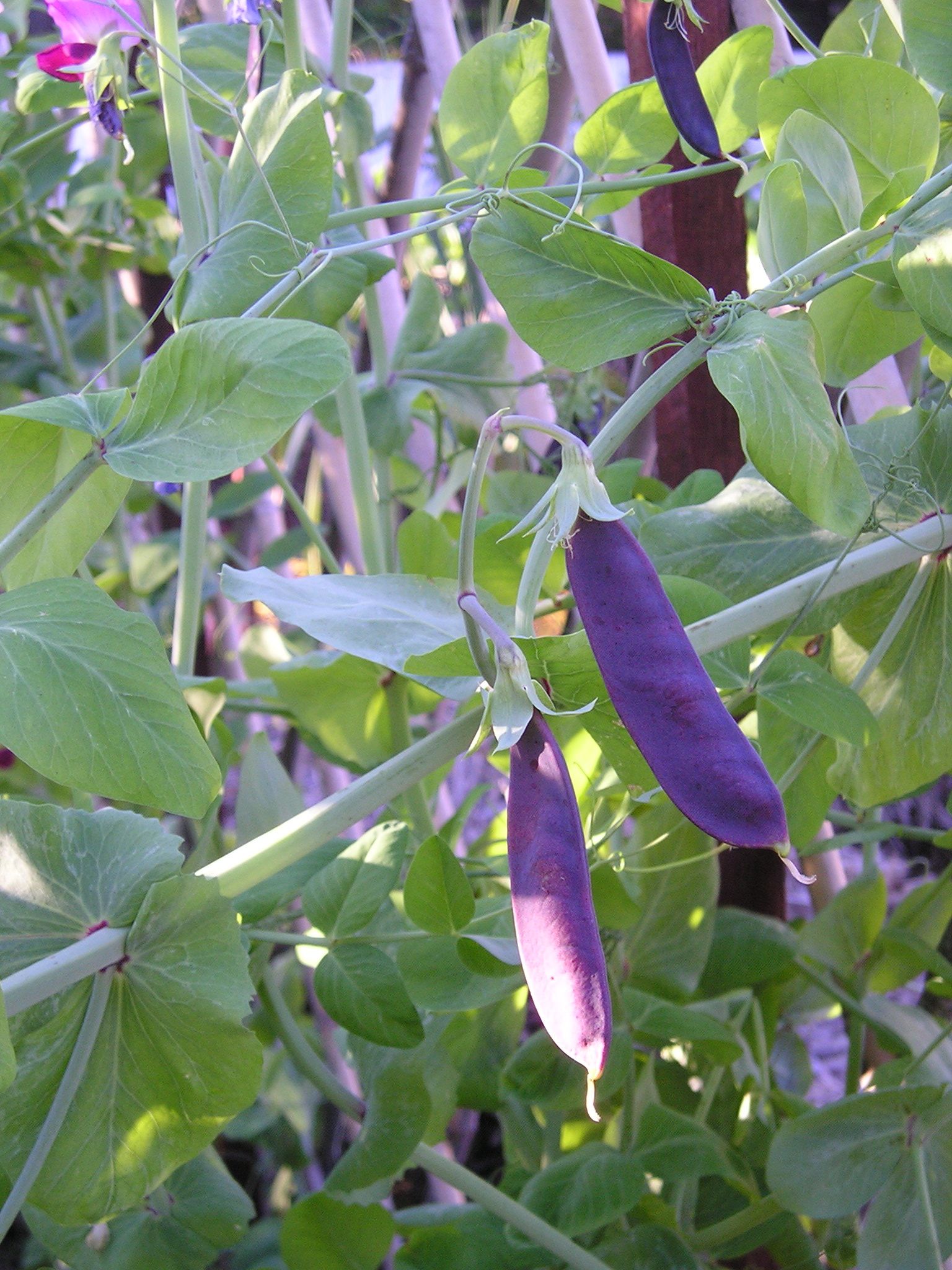 ‘Dutch Purple Podded’, (pictured top, left is one of the oldest cultivars. It’s a good cropper. It’s taller, growing just over 2m, with beautifully greyish foliage, pink flowers, bold purple pods and wrinkled brown seed. Highly ornamental.