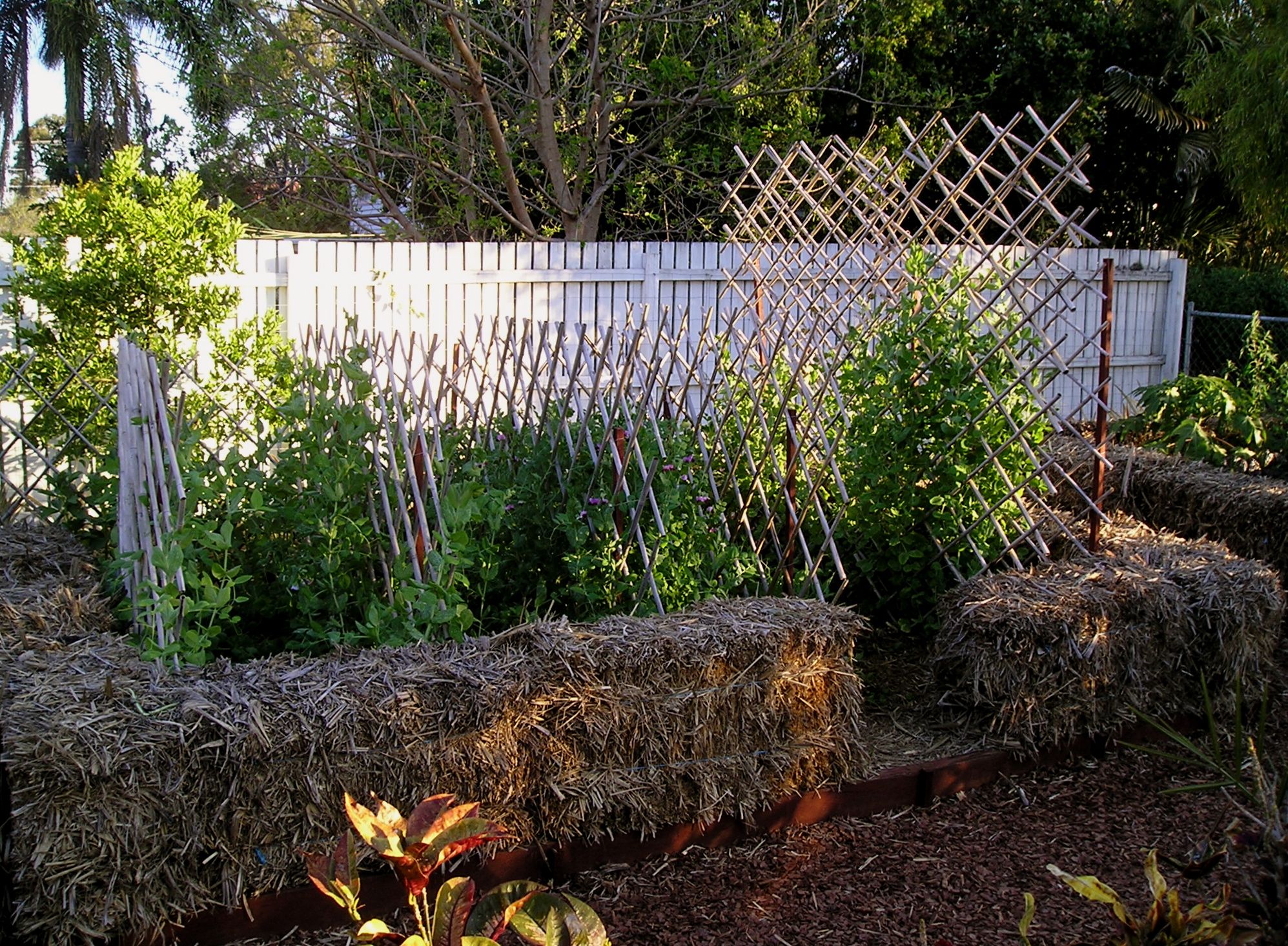 The bed is enclosed by bales of sugarcane which keep it protected from desiccating winter winds. I use bamboo frames for supporting climbing vegetables because they’re cheap, easy to install and easy to store when not in use. Bamboo isn’t ideal for their tendrils to grip, as peas prefer a rougher surface and smaller diameter twigs to twine around. In London I used to use coppiced hazel, which was perfect.