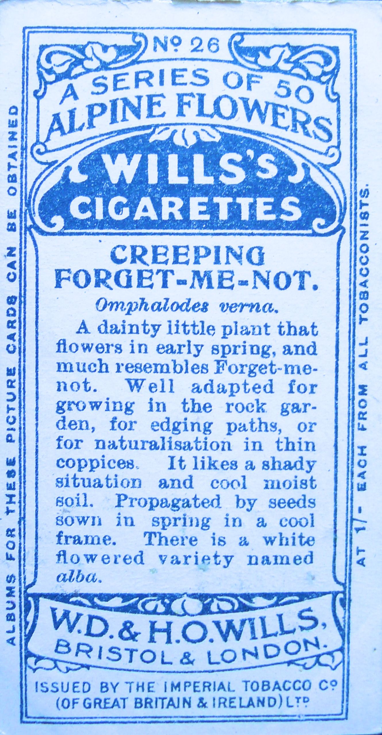 Creeping forget me not, Omphalodes verna, Wills’ Alpine Flowers, 1913 – 2
