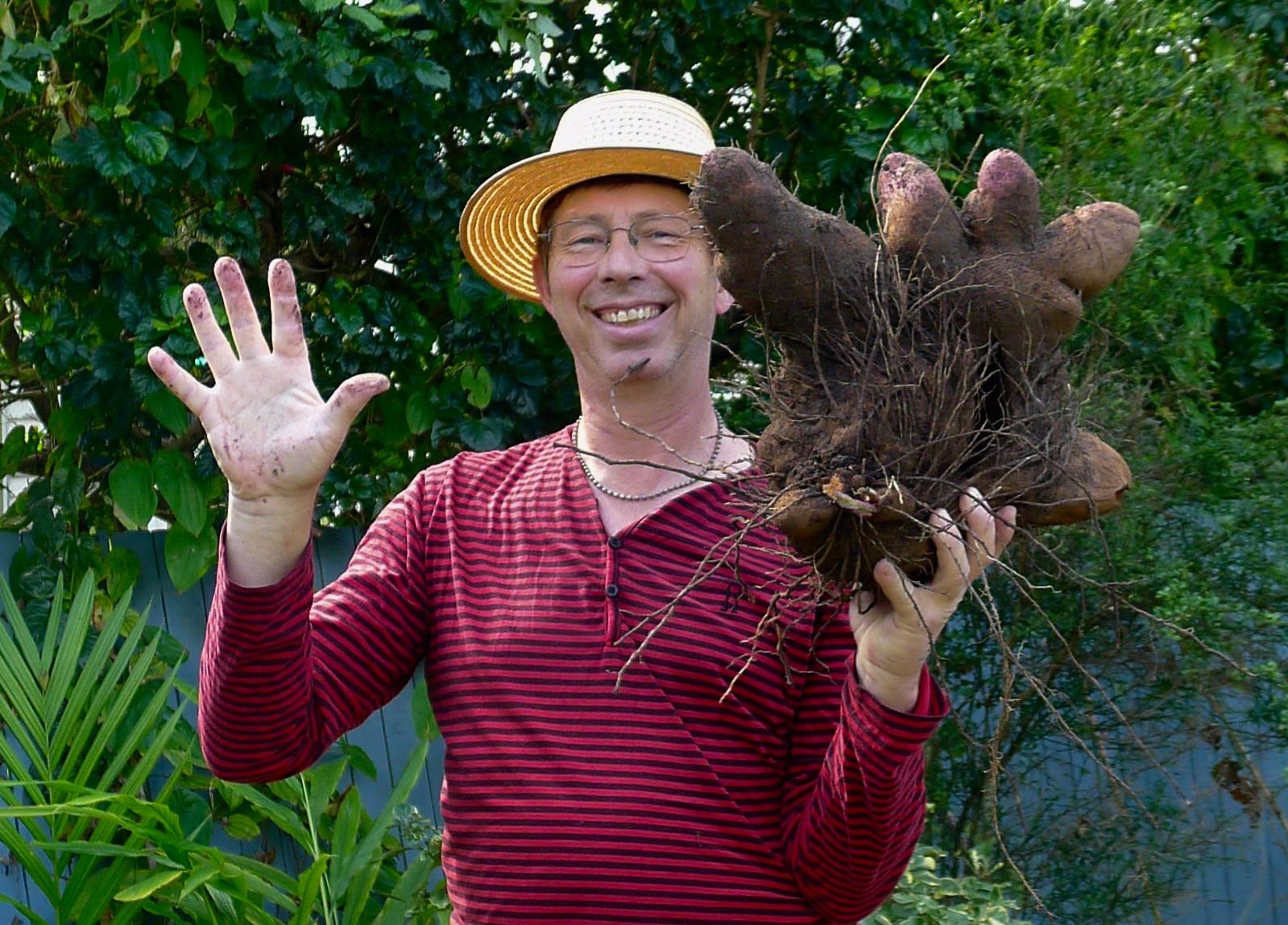 I love yams, especially when they’re served diced and boiled, or fried as wedges. For the past eleven years, these trouble-free staples have thrived in my garden. This afternoon I lifted 50 kg of tubers from three yam plants. These three occupied 3 square metres of soil. My best potato crop here in the sub-coastal subtopics is 35 kilos of ‘Kipfler’ potatoes from 10 square metres – less than a quarter of the productivity. Then you have to prevent light from turning spuds green and toxic, and you have to pay for electricity to stop them growing during storage, plus you forfeit fridge space. After I’ve brushed the soil off my yams, I store them under the house. Despite the yams being a somewhat light crop, I’m very contented with this first harvest of 2015.