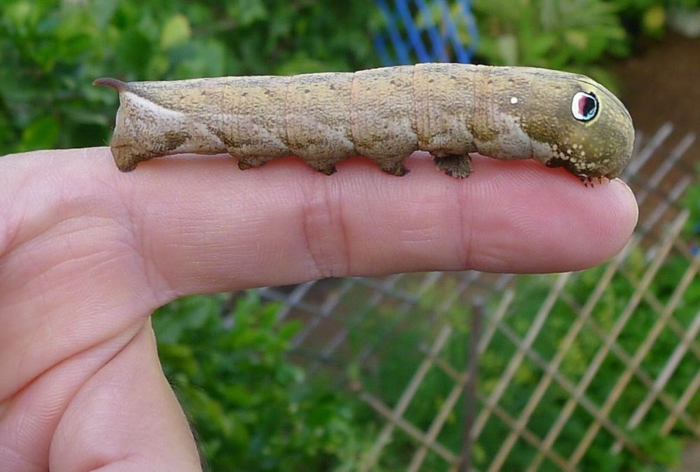 Caterpillar of the pale brown hawk moth, Theretra latreillii. Caterpillars hide during the day and feed on taro (and other plant) leaves at night. They have quite an appetite!