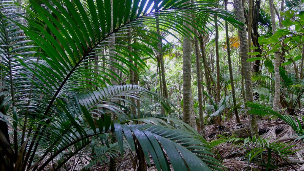 We saw moist palm gully forest, which occurs in deep valleys on the mountains Mt Pitt and Mt Bates within the Norfolk Island National Park. It has dense stands of endemic tree ferns and Rhopalostylis baueri, the fruit of the latter being a major food of the endangered endemic green parrot.
